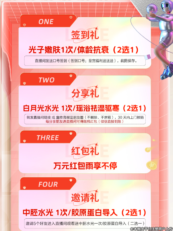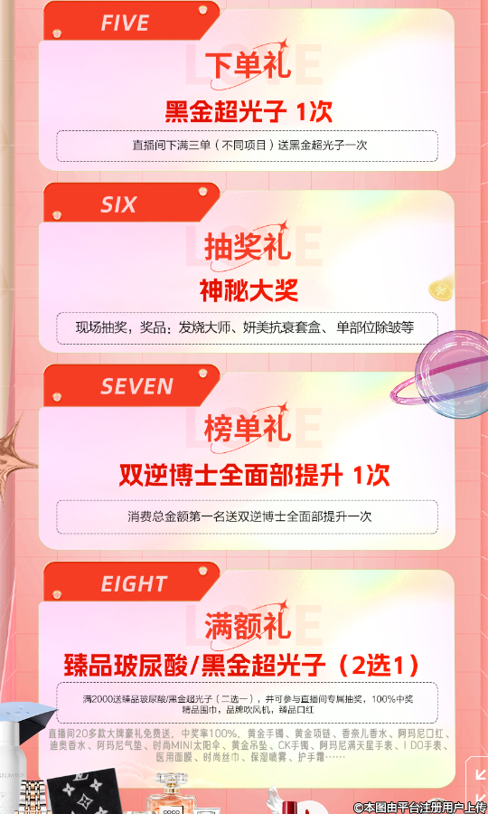 緊急通知!【阜陽(yáng)皇宮醫(yī)美年終盛典寵粉直播夜】,12月10日 晚19:30。相約直播間。100+人氣尖貨 放價(jià)嗨購(gòu)??粗辈ハ戆酥睾蓝Y、簽到禮、分享禮、紅包禮、邀請(qǐng)禮、下單禮、抽獎(jiǎng)禮、榜單禮、滿額禮,萬(wàn)元紅包雨,狂撒直播間。直播間互動(dòng)送好禮,更有多項(xiàng)年終盛典寵粉卡。現(xiàn)在入手,非常合適!為了回饋新老客戶對(duì)我們信任和支持,12.10號(hào)一場(chǎng)年終寵粉直播活動(dòng),11號(hào)還有抖音男團(tuán)直播!每天都有紅包雨,有獎(jiǎng)競(jìng)猜,免費(fèi)送項(xiàng)目的活動(dòng)。邀請(qǐng)好友進(jìn)群互動(dòng)我們也有額外的驚喜等著你,趕緊參與我們的寵粉活動(dòng)吧!