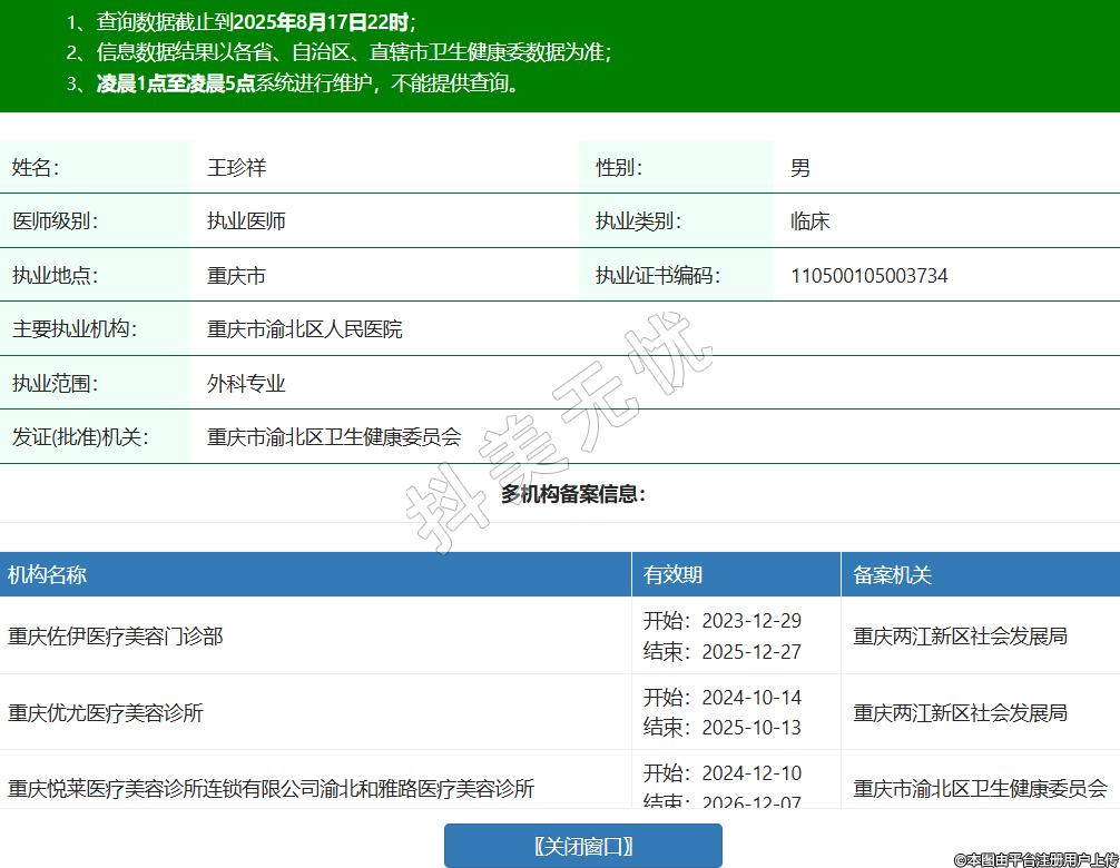 姓名:王珍祥性別:男醫(yī)師級別:執(zhí)業(yè)醫(yī)師執(zhí)業(yè)類別:臨床執(zhí)業(yè)地點:重慶市執(zhí)業(yè)證書編碼:110500105003734主要執(zhí)業(yè)機構:重慶市渝北區(qū)人民醫(yī)院執(zhí)業(yè)范圍:外科專業(yè)發(fā)證(批準)機關:重慶市渝北區(qū)衛(wèi)生健康委員會多機構備案信息:機構名稱 有效期 備案機關 重慶佐伊醫(yī)療美容門診部 開始:2023-12-29結束:2025-12-27重慶兩江新區(qū)社會發(fā)展局 重慶優(yōu)尤醫(yī)療美容診所 開始:2024-10-14結束:2025-10-13重慶兩江新區(qū)社會發(fā)展局 重慶悅萊醫(yī)療美容診所連鎖有限公司渝北和雅路醫(yī)療美容診所 開始:2024-12-10結束:2026-12-07重慶市渝北區(qū)衛(wèi)生健康委員會 重慶美麗部落渝美醫(yī)療美容門診部 開始:2025-07-21結束:2027-07-18重慶市渝北區(qū)衛(wèi)生健康委員會 -