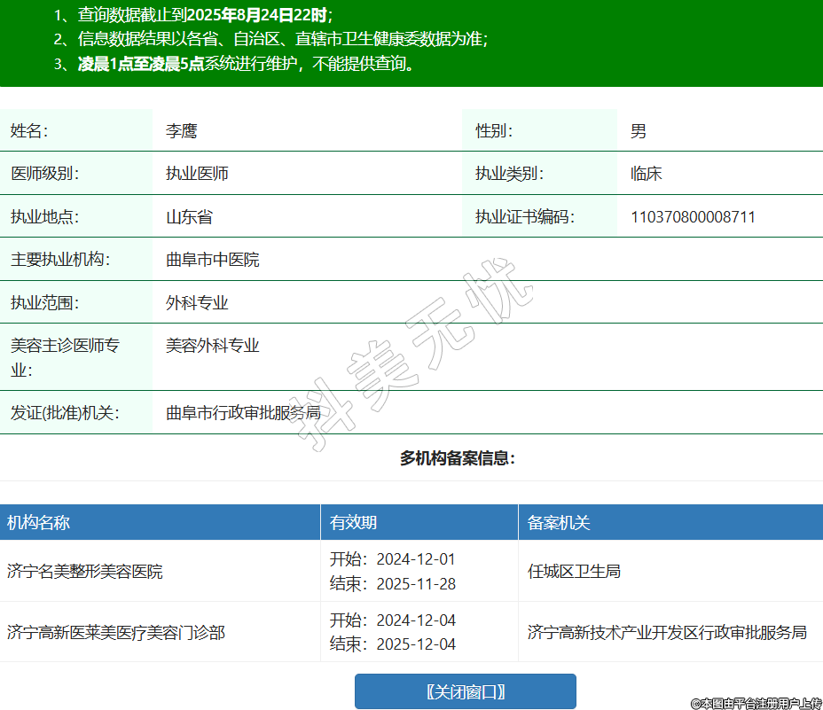 姓名:李鷹性別:男醫(yī)師級別:執(zhí)業(yè)醫(yī)師執(zhí)業(yè)類別:臨床執(zhí)業(yè)地點:山東省執(zhí)業(yè)證書編碼:110370800008711主要執(zhí)業(yè)機構(gòu):曲阜市中醫(yī)院執(zhí)業(yè)范圍:外科專業(yè)美容主診醫(yī)師專業(yè):美容外科專業(yè)發(fā)證(批準)機關:曲阜市行政審批服務局多機構(gòu)備案信息:機構(gòu)名稱 有效期 備案機關 濟寧名美整形美容醫(yī)院 開始:2024-12-01結(jié)束:2025-11-28任城區(qū)衛(wèi)生局 濟寧高新醫(yī)萊美醫(yī)療美容門診部 開始:2024-12-04結(jié)束:2025-12-04濟寧高新技術(shù)產(chǎn)業(yè)開發(fā)區(qū)行政審批服務局 -