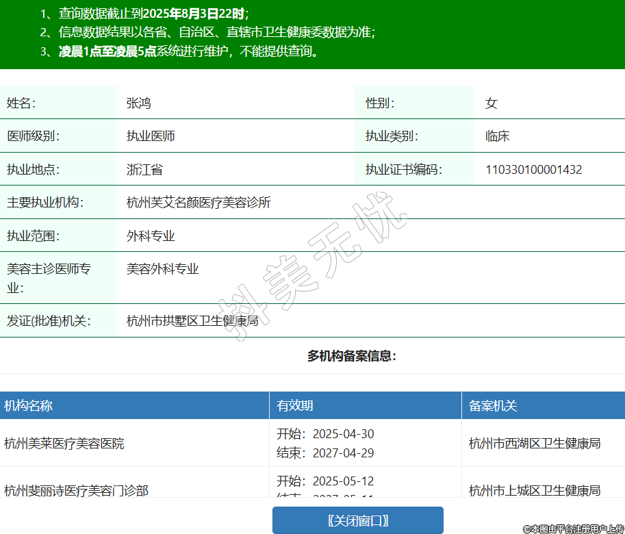 姓名:張鴻性別:女醫(yī)師級別:執(zhí)業(yè)醫(yī)師執(zhí)業(yè)類別:臨床執(zhí)業(yè)地點:浙江省執(zhí)業(yè)證書編碼:110330100001432主要執(zhí)業(yè)機構:杭州芙艾名顏醫(yī)療美容診所執(zhí)業(yè)范圍:外科專業(yè)美容主診醫(yī)師專業(yè):美容外科專業(yè)發(fā)證(批準)機關:杭州市拱墅區(qū)衛(wèi)生健康局多機構備案信息:機構名稱 有效期 備案機關 杭州美萊醫(yī)療美容醫(yī)院 開始:2025-04-30結束:2027-04-29杭州市西湖區(qū)衛(wèi)生健康局 杭州斐麗詩醫(yī)療美容門診部 開始:2025-05-12結束:2027-05-11杭州市上城區(qū)衛(wèi)生健康局 -