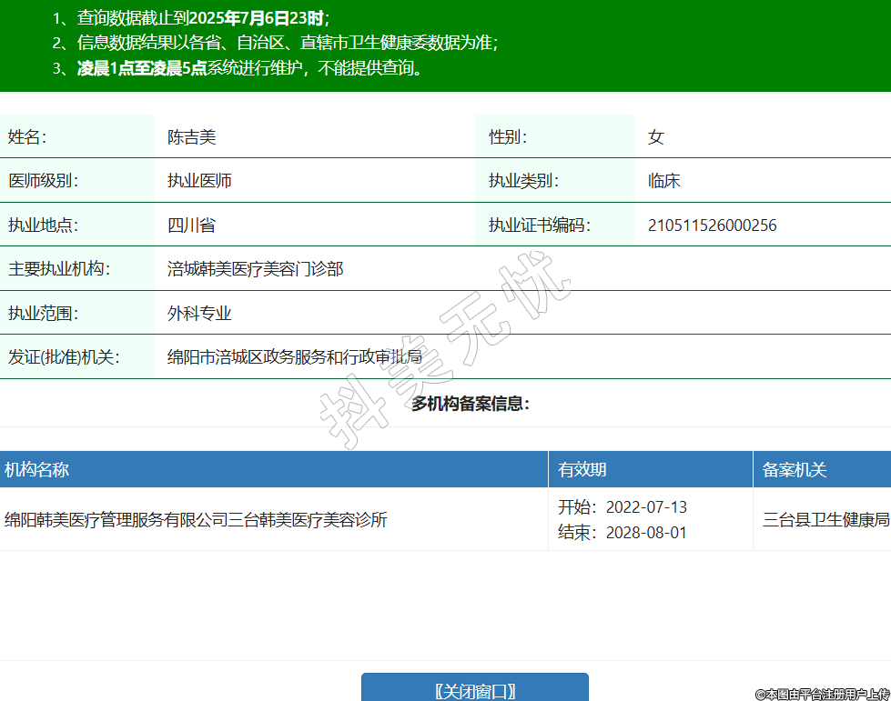 姓名:陳吉美性別:女醫(yī)師級別:執(zhí)業(yè)醫(yī)師執(zhí)業(yè)類別:臨床執(zhí)業(yè)地點:四川省執(zhí)業(yè)證書編碼:210511526000256主要執(zhí)業(yè)機(jī)構(gòu):涪城韓美醫(yī)療美容門診部執(zhí)業(yè)范圍:外科專業(yè)發(fā)證(批準(zhǔn))機(jī)關(guān):綿陽市涪城區(qū)政務(wù)服務(wù)和行政審批局多機(jī)構(gòu)備案信息:機(jī)構(gòu)名稱 有效期 備案機(jī)關(guān) 綿陽韓美醫(yī)療管理服務(wù)有限公司三臺韓美醫(yī)療美容診所 開始:2022-07-13結(jié)束:2028-08-01三臺縣衛(wèi)生健康局 -