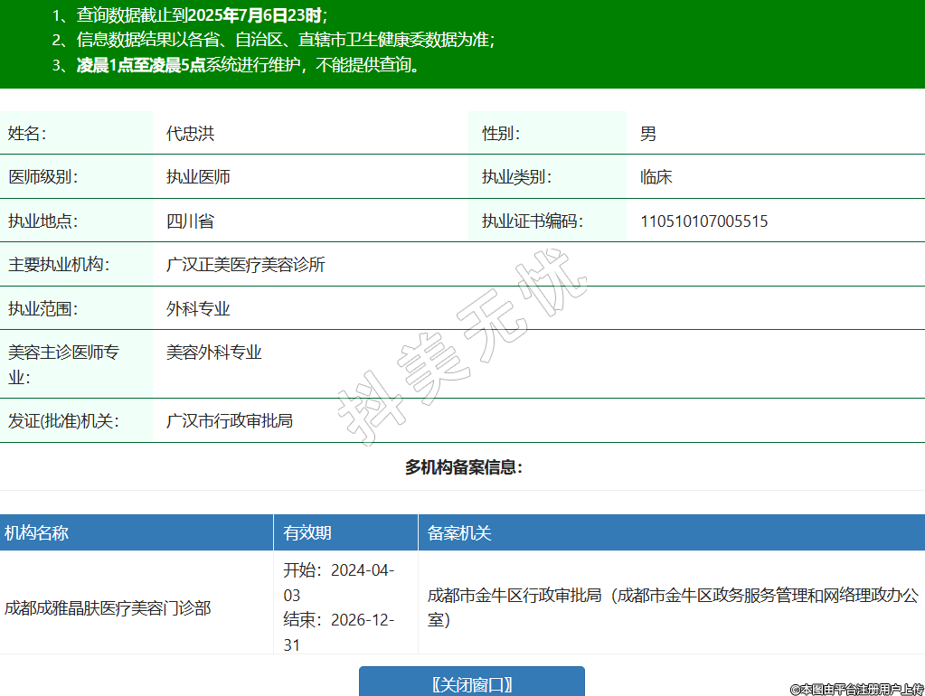 姓名:代忠洪性別:男醫(yī)師級別:執(zhí)業(yè)醫(yī)師執(zhí)業(yè)類別:臨床執(zhí)業(yè)地點:四川省執(zhí)業(yè)證書編碼:110510107005515主要執(zhí)業(yè)機構(gòu):廣漢正美醫(yī)療美容診所執(zhí)業(yè)范圍:外科專業(yè)美容主診醫(yī)師專業(yè):美容外科專業(yè)發(fā)證(批準)機關(guān):廣漢市行政審批局多機構(gòu)備案信息:機構(gòu)名稱 有效期 備案機關(guān) 成都成雅晶膚醫(yī)療美容門診部 開始:2024-04-03結(jié)束:2026-12-31成都市金牛區(qū)行政審批局(成都市金牛區(qū)政務(wù)服務(wù)管理和網(wǎng)絡(luò)理政辦公室) 成都高新中美瑞辰綜合門診部 開始:2024-04-04結(jié)束:2026-12-31成都高新技術(shù)產(chǎn)業(yè)開發(fā)區(qū)衛(wèi)生健康局 成都青羊侑姿醫(yī)療美容門診部 開始:2024-04-09結(jié)束:2026-12-08成都市青羊區(qū)行政審批局(成都市青羊區(qū)政務(wù)服務(wù)管理和網(wǎng)絡(luò)理政辦公室) 華人醫(yī)聯(lián)整形美容醫(yī)院 開始:2024-04-15結(jié)束:2026-12-31成都市青羊區(qū)行政審批局(成都市青羊區(qū)政務(wù)服務(wù)管理和網(wǎng)絡(luò)理政辦公室) 成都高新熙之環(huán)亞醫(yī)療美容醫(yī)院 開始:2024-04-24結(jié)束:2026-12-31成都高新技術(shù)產(chǎn)業(yè)開發(fā)區(qū)衛(wèi)生健康局 成都武侯華生鉑悅美容醫(yī)院 開始:2024-05-15結(jié)束:2028-12-31成都市武侯區(qū)行政審批局 成都青羊華人醫(yī)聯(lián)為美醫(yī)療美容門診部 開始:2024-07-06結(jié)束:2027-12-31成都市青羊區(qū)行政審批局(成都市青羊區(qū)政務(wù)服務(wù)管理和網(wǎng)絡(luò)理政辦公室) 成都武侯圣形醫(yī)療美容門診部 開始:2024-08-21結(jié)束:2026-12-31成都市武侯區(qū)行政審批局 成都高新科賦麗爾醫(yī)療美容診所 開始:2024-10-22結(jié)束:2026-10-31成都高新技術(shù)產(chǎn)業(yè)開發(fā)區(qū)衛(wèi)生健康局 -