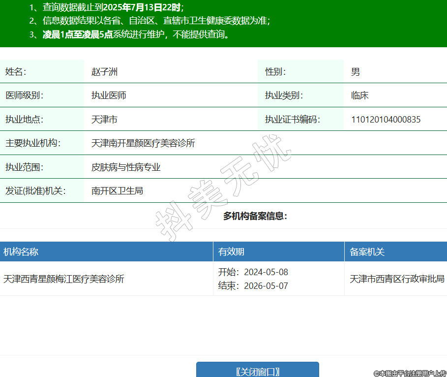姓名:趙子洲性別:男醫(yī)師級別:執(zhí)業(yè)醫(yī)師執(zhí)業(yè)類別:臨床執(zhí)業(yè)地點:天津市執(zhí)業(yè)證書編碼:110120104000835主要執(zhí)業(yè)機(jī)構(gòu):天津南開星顏醫(yī)療美容診所執(zhí)業(yè)范圍:皮膚病與性病專業(yè)發(fā)證(批準(zhǔn))機(jī)關(guān):南開區(qū)衛(wèi)生局多機(jī)構(gòu)備案信息:機(jī)構(gòu)名稱 有效期 備案機(jī)關(guān) 天津西青星顏梅江醫(yī)療美容診所 開始:2024-05-08結(jié)束:2026-05-07天津市西青區(qū)行政審批局 -