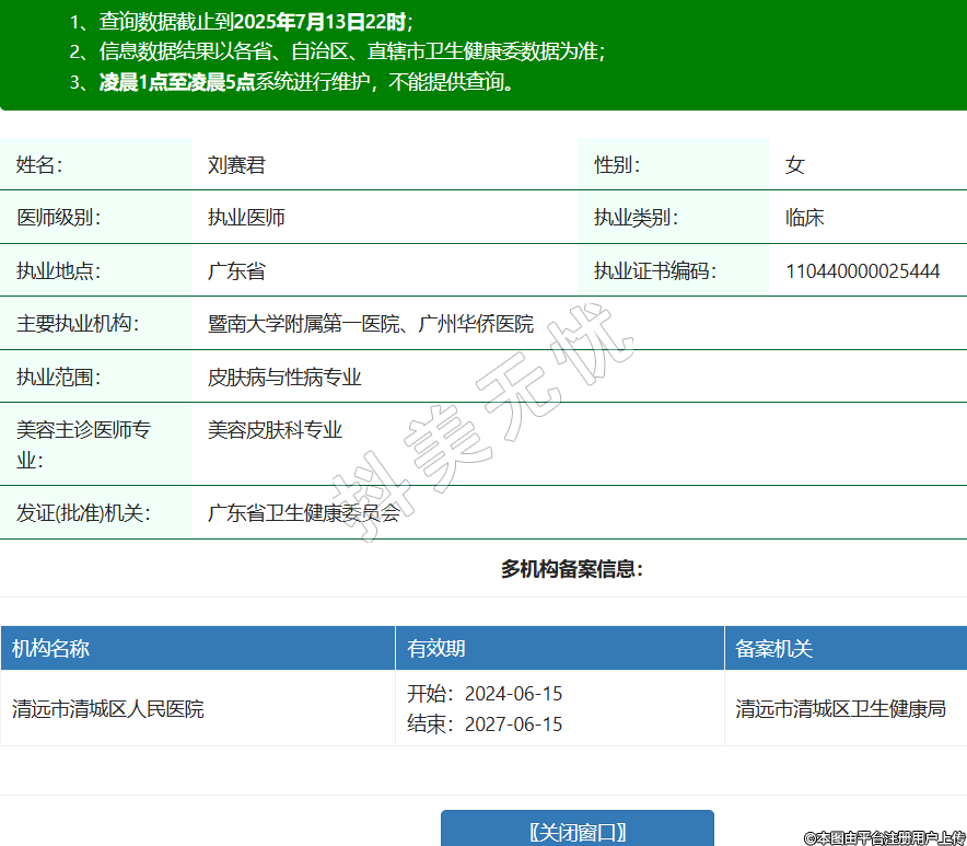 姓名:劉賽君性別:女醫(yī)師級別:執(zhí)業(yè)醫(yī)師執(zhí)業(yè)類別:臨床執(zhí)業(yè)地點:廣東省執(zhí)業(yè)證書編碼:110440000025444主要執(zhí)業(yè)機構(gòu):暨南大學(xué)附屬第一醫(yī)院、廣州華僑醫(yī)院執(zhí)業(yè)范圍:皮膚病與性病專業(yè)美容主診醫(yī)師專業(yè):美容皮膚科專業(yè)發(fā)證(批準(zhǔn))機關(guān):廣東省衛(wèi)生健康委員會多機構(gòu)備案信息:機構(gòu)名稱 有效期 備案機關(guān) 清遠(yuǎn)市清城區(qū)人民醫(yī)院 開始:2024-06-15結(jié)束:2027-06-15清遠(yuǎn)市清城區(qū)衛(wèi)生健康局 -