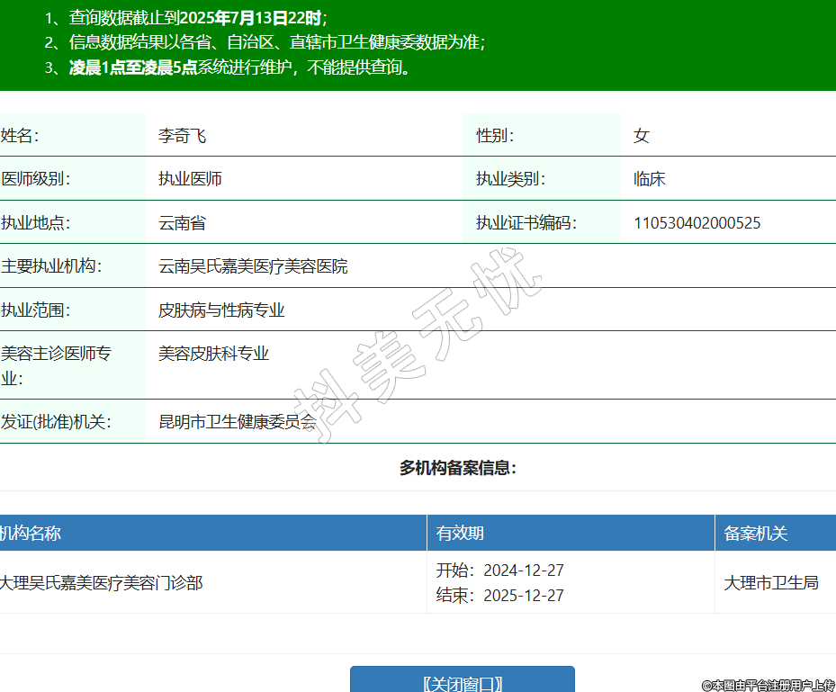 姓名:李奇飛性別:女醫(yī)師級(jí)別:執(zhí)業(yè)醫(yī)師執(zhí)業(yè)類別:臨床執(zhí)業(yè)地點(diǎn):云南省執(zhí)業(yè)證書編碼:110530402000525主要執(zhí)業(yè)機(jī)構(gòu):云南吳氏嘉美醫(yī)療美容醫(yī)院執(zhí)業(yè)范圍:皮膚病與性病專業(yè)美容主診醫(yī)師專業(yè):美容皮膚科專業(yè)發(fā)證(批準(zhǔn))機(jī)關(guān):昆明市衛(wèi)生健康委員會(huì)多機(jī)構(gòu)備案信息:機(jī)構(gòu)名稱 有效期 備案機(jī)關(guān) 大理吳氏嘉美醫(yī)療美容門診部 開始:2024-12-27結(jié)束:2025-12-27大理市衛(wèi)生局 -