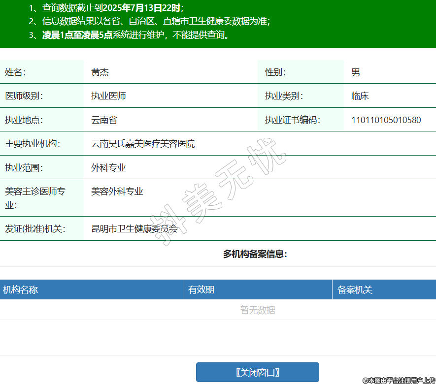 姓名:黃杰性別:男醫(yī)師級別:執(zhí)業(yè)醫(yī)師執(zhí)業(yè)類別:臨床執(zhí)業(yè)地點:云南省執(zhí)業(yè)證書編碼:110110105010580主要執(zhí)業(yè)機構:云南吳氏嘉美醫(yī)療美容醫(yī)院執(zhí)業(yè)范圍:外科專業(yè)美容主診醫(yī)師專業(yè):美容外科專業(yè)發(fā)證(批準)機關:昆明市衛(wèi)生健康委員會 -