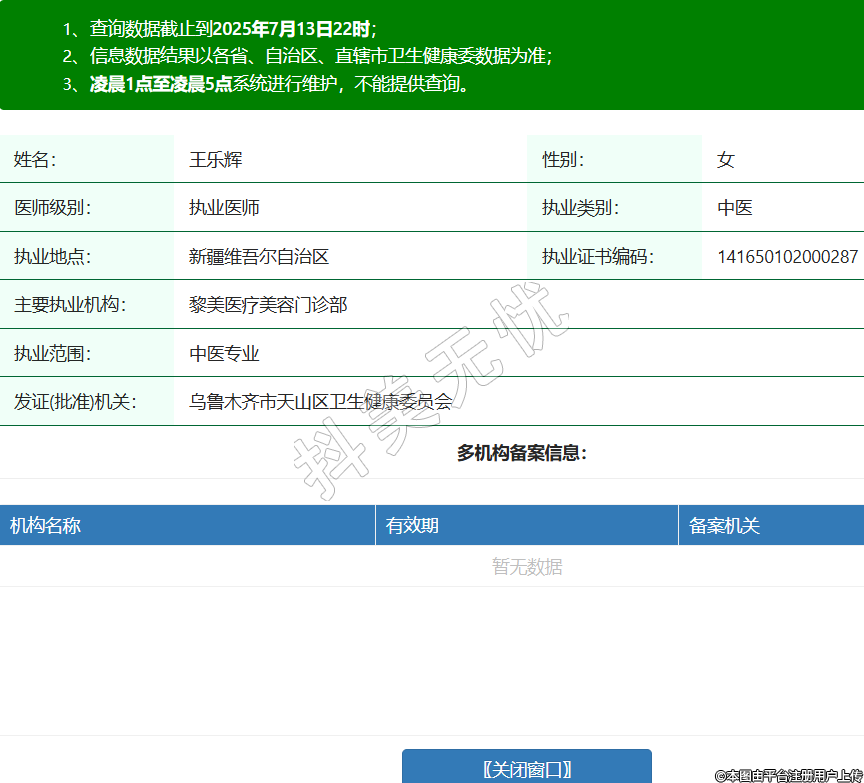 姓名:王樂(lè)輝性別:女醫(yī)師級(jí)別:執(zhí)業(yè)醫(yī)師執(zhí)業(yè)類別:中醫(yī)執(zhí)業(yè)地點(diǎn):新疆維吾爾自治區(qū)執(zhí)業(yè)證書(shū)編碼:141650102000287主要執(zhí)業(yè)機(jī)構(gòu):黎美醫(yī)療美容門(mén)診部執(zhí)業(yè)范圍:中醫(yī)專業(yè)發(fā)證(批準(zhǔn))機(jī)關(guān):烏魯木齊市天山區(qū)衛(wèi)生健康委員會(huì) -