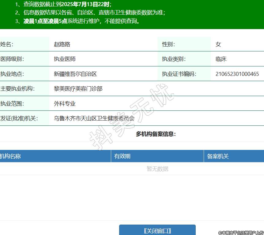 姓名:趙路路性別:女醫(yī)師級別:執(zhí)業(yè)醫(yī)師執(zhí)業(yè)類別:臨床執(zhí)業(yè)地點:新疆維吾爾自治區(qū)執(zhí)業(yè)證書編碼:210652301000465主要執(zhí)業(yè)機構:黎美醫(yī)療美容門診部執(zhí)業(yè)范圍:外科專業(yè)發(fā)證(批準)機關:烏魯木齊市天山區(qū)衛(wèi)生健康委員會 -