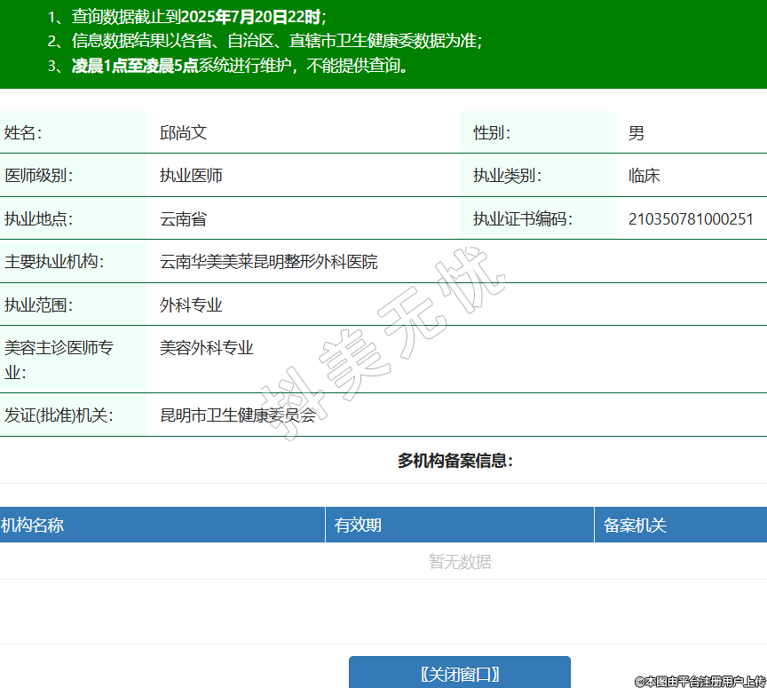 姓名:邱尚文性別:男醫(yī)師級別:執(zhí)業(yè)醫(yī)師執(zhí)業(yè)類別:臨床執(zhí)業(yè)地點:云南省執(zhí)業(yè)證書編碼:210350781000251主要執(zhí)業(yè)機構(gòu):云南華美美萊昆明整形外科醫(yī)院執(zhí)業(yè)范圍:外科專業(yè)美容主診醫(yī)師專業(yè):美容外科專業(yè)發(fā)證(批準)機關(guān):昆明市衛(wèi)生健康委員會 -