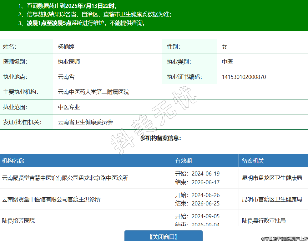 姓名:楊榆婷性別:女醫(yī)師級(jí)別:執(zhí)業(yè)醫(yī)師執(zhí)業(yè)類別:中醫(yī)執(zhí)業(yè)地點(diǎn):云南省執(zhí)業(yè)證書編碼:141530102000870主要執(zhí)業(yè)機(jī)構(gòu):云南中醫(yī)藥大學(xué)第二附屬醫(yī)院執(zhí)業(yè)范圍:中醫(yī)專業(yè)發(fā)證(批準(zhǔn))機(jī)關(guān):云南省衛(wèi)生健康委員會(huì)多機(jī)構(gòu)備案信息:機(jī)構(gòu)名稱 有效期 備案機(jī)關(guān) 云南聚賢堂吉慧中醫(yī)館有限公司盤龍北京路中醫(yī)診所 開始:2024-06-19結(jié)束:2026-06-17昆明市盤龍區(qū)衛(wèi)生健康局 云南聚賢堂中醫(yī)館有限公司官渡王洪診所 開始:2024-06-26結(jié)束:2026-06-25昆明市官渡區(qū)衛(wèi)生健康局 陸良培芳醫(yī)院 開始:2024-09-05結(jié)束:2026-09-04陸良縣行政審批局 -