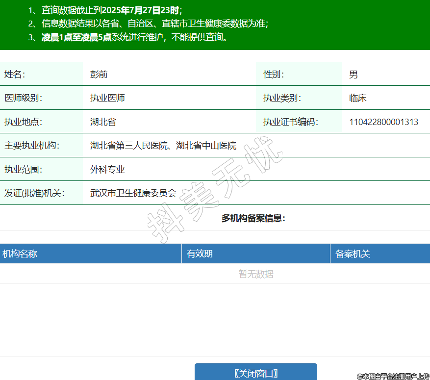 姓名:彭前性別:男醫(yī)師級(jí)別:執(zhí)業(yè)醫(yī)師執(zhí)業(yè)類別:臨床執(zhí)業(yè)地點(diǎn):湖北省執(zhí)業(yè)證書編碼:110422800001313主要執(zhí)業(yè)機(jī)構(gòu):湖北省第三人民醫(yī)院、湖北省中山醫(yī)院執(zhí)業(yè)范圍:外科專業(yè)發(fā)證(批準(zhǔn))機(jī)關(guān):武漢市衛(wèi)生健康委員會(huì) -