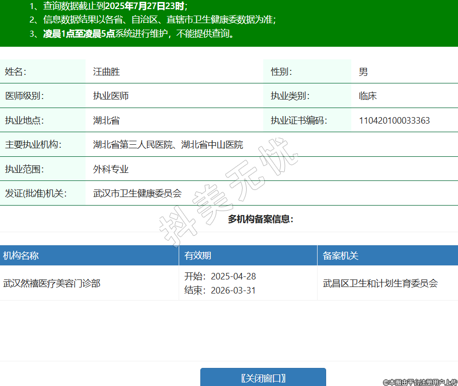 姓名:汪曲勝性別:男醫(yī)師級別:執(zhí)業(yè)醫(yī)師執(zhí)業(yè)類別:臨床執(zhí)業(yè)地點:湖北省執(zhí)業(yè)證書編碼:110420100033363主要執(zhí)業(yè)機構:湖北省第三人民醫(yī)院、湖北省中山醫(yī)院執(zhí)業(yè)范圍:外科專業(yè)發(fā)證(批準)機關:武漢市衛(wèi)生健康委員會多機構備案信息:機構名稱 有效期 備案機關 武漢然禧醫(yī)療美容門診部 開始:2025-04-28結束:2026-03-31武昌區(qū)衛(wèi)生和計劃生育委員會 -