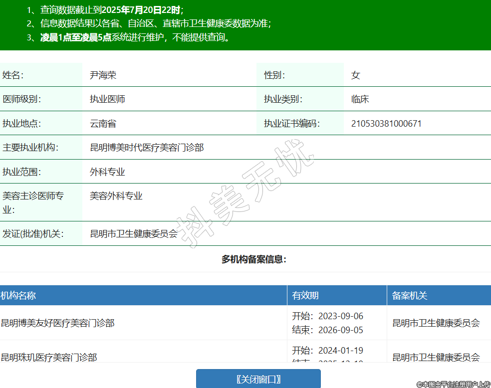 姓名:尹海榮性別:女醫(yī)師級(jí)別:執(zhí)業(yè)醫(yī)師執(zhí)業(yè)類(lèi)別:臨床執(zhí)業(yè)地點(diǎn):云南省執(zhí)業(yè)證書(shū)編碼:210530381000671主要執(zhí)業(yè)機(jī)構(gòu):昆明博美時(shí)代醫(yī)療美容門(mén)診部執(zhí)業(yè)范圍:外科專(zhuān)業(yè)美容主診醫(yī)師專(zhuān)業(yè):美容外科專(zhuān)業(yè)發(fā)證(批準(zhǔn))機(jī)關(guān):昆明市衛(wèi)生健康委員會(huì)多機(jī)構(gòu)備案信息:機(jī)構(gòu)名稱(chēng) 有效期 備案機(jī)關(guān) 昆明博美友好醫(yī)療美容門(mén)診部 開(kāi)始:2023-09-06結(jié)束:2026-09-05昆明市衛(wèi)生健康委員會(huì) 昆明珠璣醫(yī)療美容門(mén)診部 開(kāi)始:2024-01-19結(jié)束:2025-12-18昆明市衛(wèi)生健康委員會(huì) 云南比爾西希生物科技有限公司盤(pán)龍麗水雅苑醫(yī)療美容診所 開(kāi)始:2024-06-14結(jié)束:2027-06-14昆明市盤(pán)龍區(qū)衛(wèi)生健康局 紅河博美醫(yī)療美容門(mén)診部 開(kāi)始:2025-05-15結(jié)束:2026-05-14蒙自市衛(wèi)生健康局 -