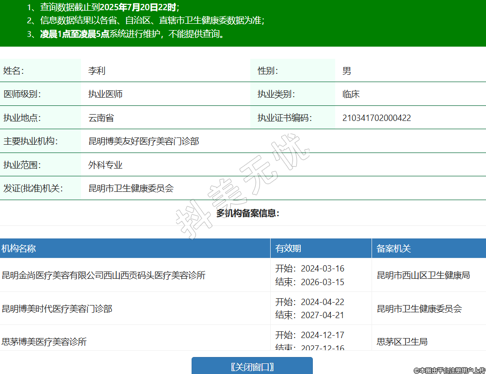 姓名:李利性別:男醫(yī)師級別:執(zhí)業(yè)醫(yī)師執(zhí)業(yè)類別:臨床執(zhí)業(yè)地點:云南省執(zhí)業(yè)證書編碼:210341702000422主要執(zhí)業(yè)機構(gòu):昆明博美友好醫(yī)療美容門診部執(zhí)業(yè)范圍:外科專業(yè)發(fā)證(批準(zhǔn))機關(guān):昆明市衛(wèi)生健康委員會多機構(gòu)備案信息:機構(gòu)名稱 有效期 備案機關(guān) 昆明金尚醫(yī)療美容有限公司西山西貢碼頭醫(yī)療美容診所 開始:2024-03-16結(jié)束:2026-03-15昆明市西山區(qū)衛(wèi)生健康局 昆明博美時代醫(yī)療美容門診部 開始:2024-04-22結(jié)束:2027-04-21昆明市衛(wèi)生健康委員會 思茅博美醫(yī)療美容診所 開始:2024-12-17結(jié)束:2027-12-16思茅區(qū)衛(wèi)生局 -