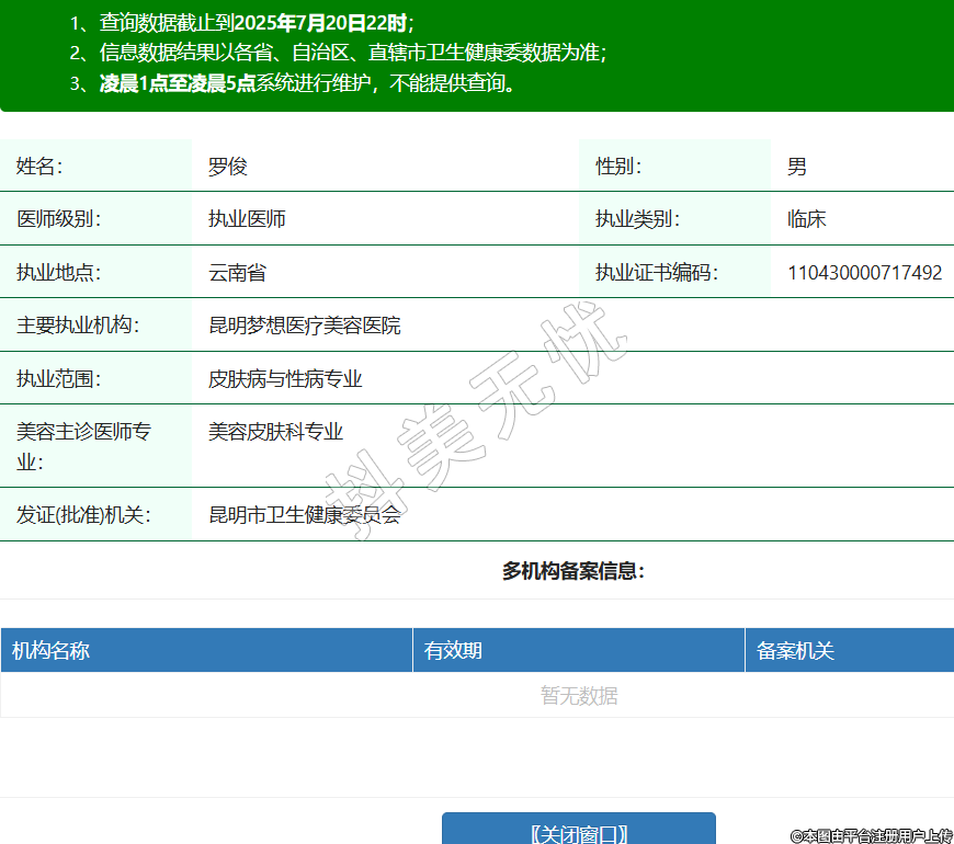 姓名:羅俊性別:男醫(yī)師級(jí)別:執(zhí)業(yè)醫(yī)師執(zhí)業(yè)類別:臨床執(zhí)業(yè)地點(diǎn):云南省執(zhí)業(yè)證書編碼:110430000717492主要執(zhí)業(yè)機(jī)構(gòu):昆明夢(mèng)想醫(yī)療美容醫(yī)院執(zhí)業(yè)范圍:皮膚病與性病專業(yè)美容主診醫(yī)師專業(yè):美容皮膚科專業(yè)發(fā)證(批準(zhǔn))機(jī)關(guān):昆明市衛(wèi)生健康委員會(huì) -