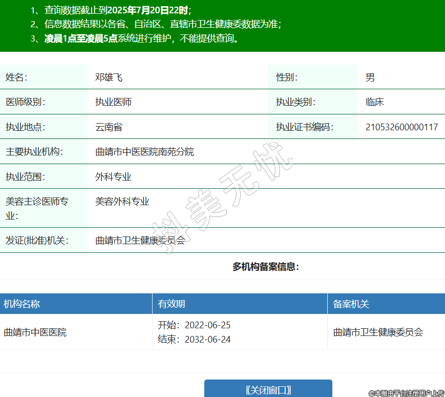 姓名:鄧雄飛性別:男醫(yī)師級(jí)別:執(zhí)業(yè)醫(yī)師執(zhí)業(yè)類別:臨床執(zhí)業(yè)地點(diǎn):云南省執(zhí)業(yè)證書編碼:210532600000117主要執(zhí)業(yè)機(jī)構(gòu):曲靖市中醫(yī)醫(yī)院南苑分院執(zhí)業(yè)范圍:外科專業(yè)美容主診醫(yī)師專業(yè):美容外科專業(yè)發(fā)證(批準(zhǔn))機(jī)關(guān):曲靖市衛(wèi)生健康委員會(huì)多機(jī)構(gòu)備案信息:機(jī)構(gòu)名稱 有效期 備案機(jī)關(guān) 曲靖市中醫(yī)醫(yī)院 開始:2022-06-25結(jié)束:2032-06-24曲靖市衛(wèi)生健康委員會(huì) -