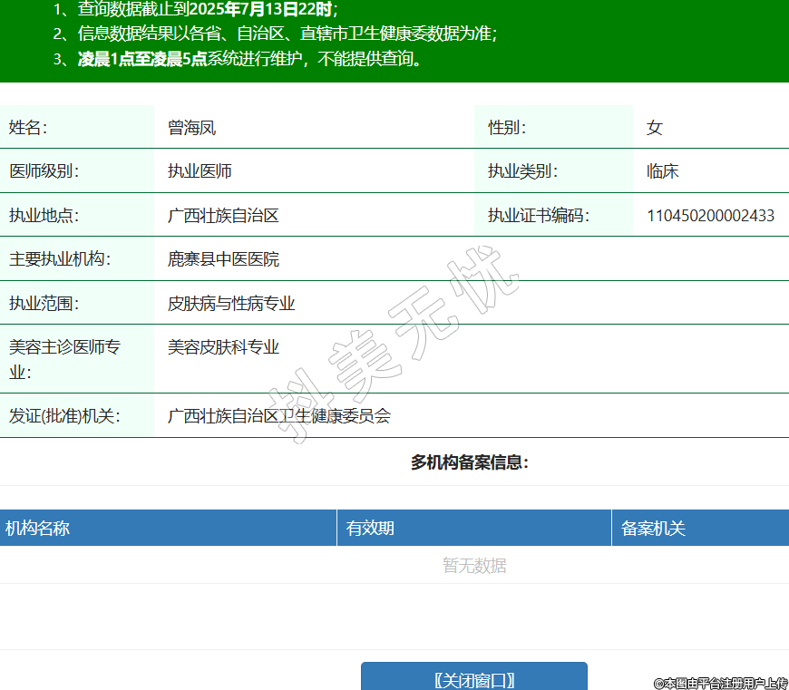 姓名:曾海鳳性別:女醫(yī)師級別:執(zhí)業(yè)醫(yī)師執(zhí)業(yè)類別:臨床執(zhí)業(yè)地點:廣西壯族自治區(qū)執(zhí)業(yè)證書編碼:110450200002433主要執(zhí)業(yè)機構(gòu):鹿寨縣中醫(yī)醫(yī)院執(zhí)業(yè)范圍:皮膚病與性病專業(yè)美容主診醫(yī)師專業(yè):美容皮膚科專業(yè)發(fā)證(批準(zhǔn))機關(guān):廣西壯族自治區(qū)衛(wèi)生健康委員會 -