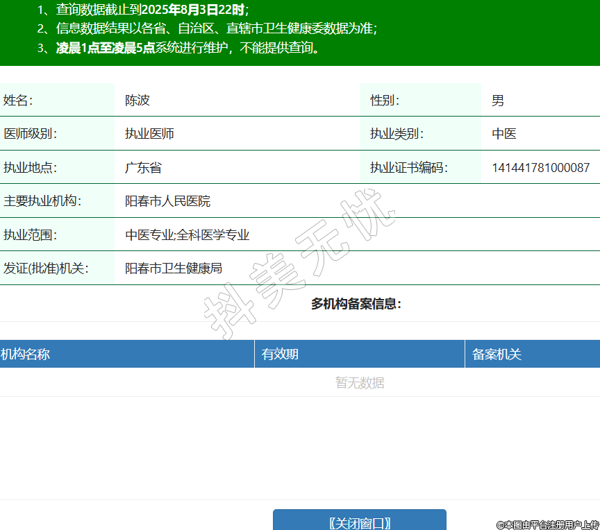 姓名:陳波性別:男醫(yī)師級(jí)別:執(zhí)業(yè)醫(yī)師執(zhí)業(yè)類別:中醫(yī)執(zhí)業(yè)地點(diǎn):廣東省執(zhí)業(yè)證書編碼:141441781000087主要執(zhí)業(yè)機(jī)構(gòu):陽(yáng)春市人民醫(yī)院執(zhí)業(yè)范圍:中醫(yī)專業(yè);全科醫(yī)學(xué)專業(yè)發(fā)證(批準(zhǔn))機(jī)關(guān):陽(yáng)春市衛(wèi)生健康局 -