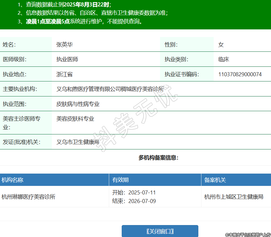 姓名:張英華性別:女醫(yī)師級別:執(zhí)業(yè)醫(yī)師執(zhí)業(yè)類別:臨床執(zhí)業(yè)地點:浙江省執(zhí)業(yè)證書編碼:110370829000074主要執(zhí)業(yè)機構(gòu):義烏和煦醫(yī)療管理有限公司稠城醫(yī)療美容診所執(zhí)業(yè)范圍:皮膚病與性病專業(yè)美容主診醫(yī)師專業(yè):美容皮膚科專業(yè)發(fā)證(批準)機關(guān):義烏市衛(wèi)生健康局多機構(gòu)備案信息:機構(gòu)名稱 有效期 備案機關(guān) 杭州琳娜醫(yī)療美容診所 開始:2025-07-11結(jié)束:2026-07-09杭州市上城區(qū)衛(wèi)生健康局 -