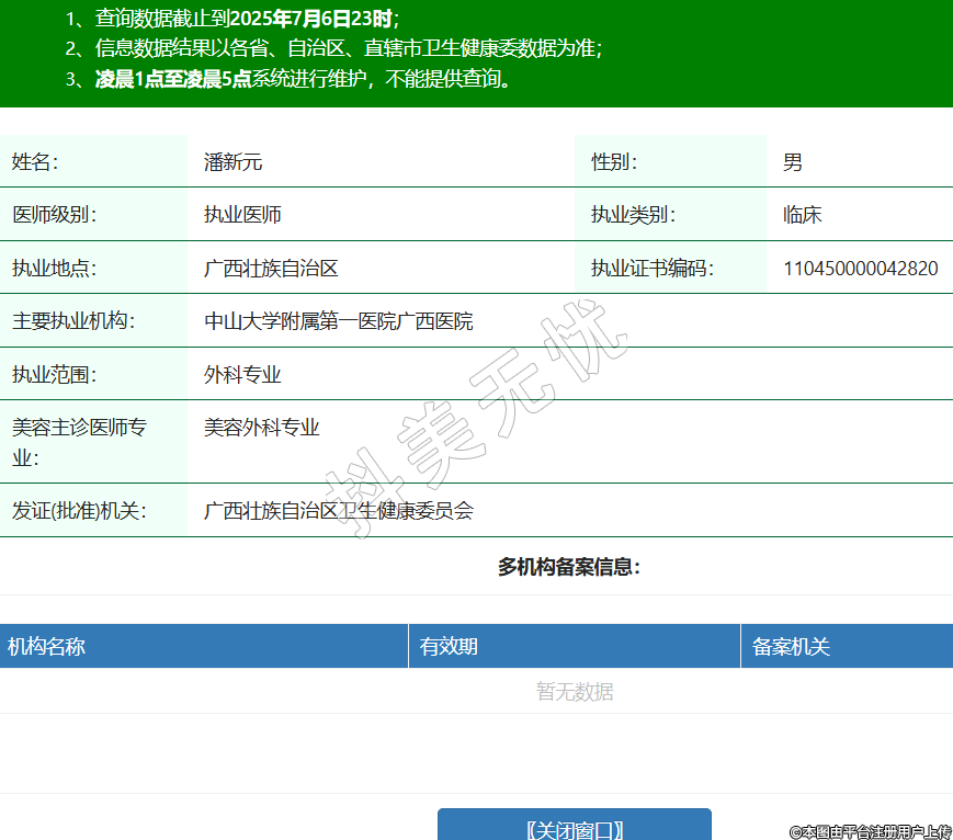 姓名:潘新元性別:男醫(yī)師級別:執(zhí)業(yè)醫(yī)師執(zhí)業(yè)類別:臨床執(zhí)業(yè)地點:廣西壯族自治區(qū)執(zhí)業(yè)證書編碼:110450000042820主要執(zhí)業(yè)機構:中山大學附屬第一醫(yī)院廣西醫(yī)院執(zhí)業(yè)范圍:外科專業(yè)美容主診醫(yī)師專業(yè):美容外科專業(yè)發(fā)證(批準)機關:廣西壯族自治區(qū)衛(wèi)生健康委員會 -