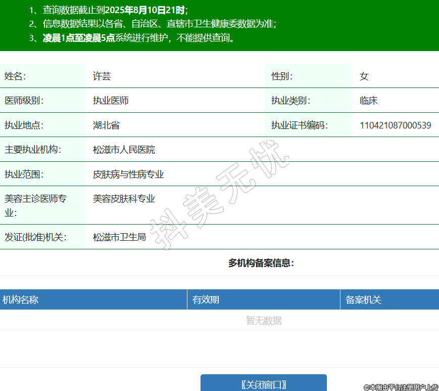 姓名:許蕓性別:女醫(yī)師級別:執(zhí)業(yè)醫(yī)師執(zhí)業(yè)類別:臨床執(zhí)業(yè)地點:湖北省執(zhí)業(yè)證書編碼:110421087000539主要執(zhí)業(yè)機構:松滋市人民醫(yī)院執(zhí)業(yè)范圍:皮膚病與性病專業(yè)美容主診醫(yī)師專業(yè):美容皮膚科專業(yè)發(fā)證(批準)機關:松滋市衛(wèi)生局 -