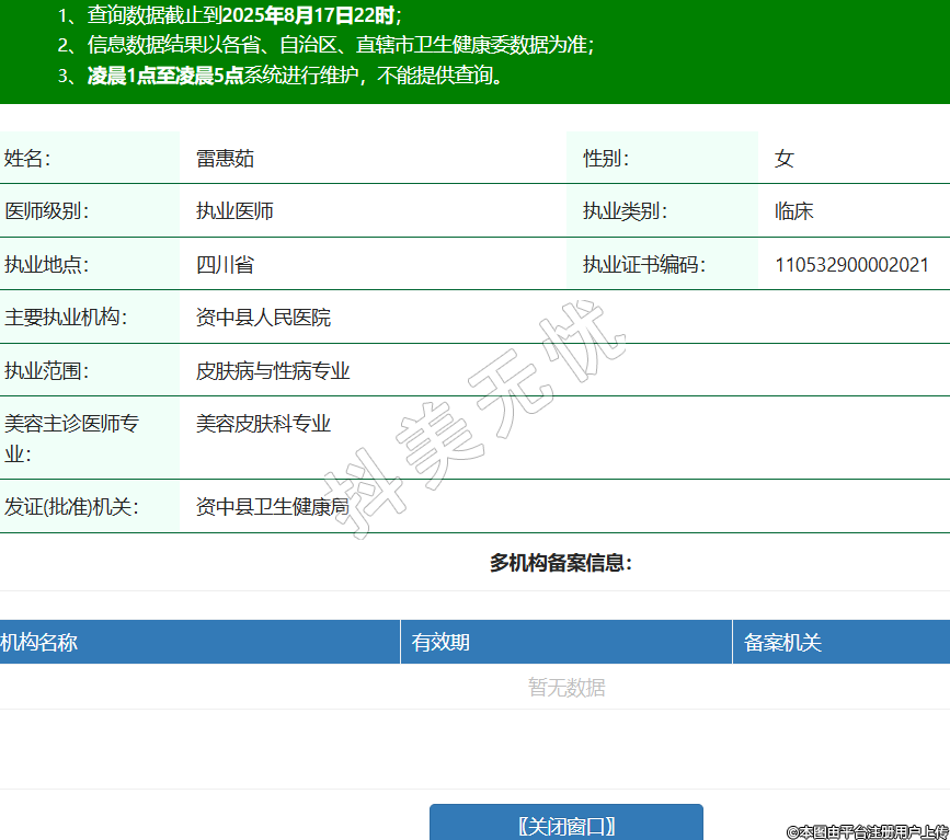 名:雷惠茹性別:女醫(yī)師級(jí)別:執(zhí)業(yè)醫(yī)師執(zhí)業(yè)類別:臨床執(zhí)業(yè)地點(diǎn):四川省執(zhí)業(yè)證書編碼:110532900002021主要執(zhí)業(yè)機(jī)構(gòu):資中縣人民醫(yī)院執(zhí)業(yè)范圍:皮膚病與性病專業(yè)美容主診醫(yī)師專業(yè):美容皮膚科專業(yè)發(fā)證(批準(zhǔn))機(jī)關(guān):資中縣衛(wèi)生健康局 -