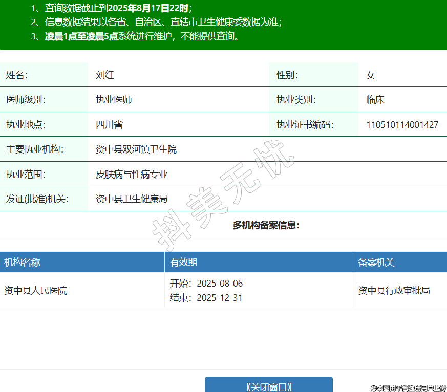 姓名:劉紅性別:女醫(yī)師級別:執(zhí)業(yè)醫(yī)師執(zhí)業(yè)類別:臨床執(zhí)業(yè)地點:四川省執(zhí)業(yè)證書編碼:110510114001427主要執(zhí)業(yè)機構(gòu):資中縣雙河鎮(zhèn)衛(wèi)生院執(zhí)業(yè)范圍:皮膚病與性病專業(yè)發(fā)證(批準)機關(guān):資中縣衛(wèi)生健康局多機構(gòu)備案信息:機構(gòu)名稱 有效期 備案機關(guān) 資中縣人民醫(yī)院 開始:2025-08-06結(jié)束:2025-12-31資中縣行政審批局 -