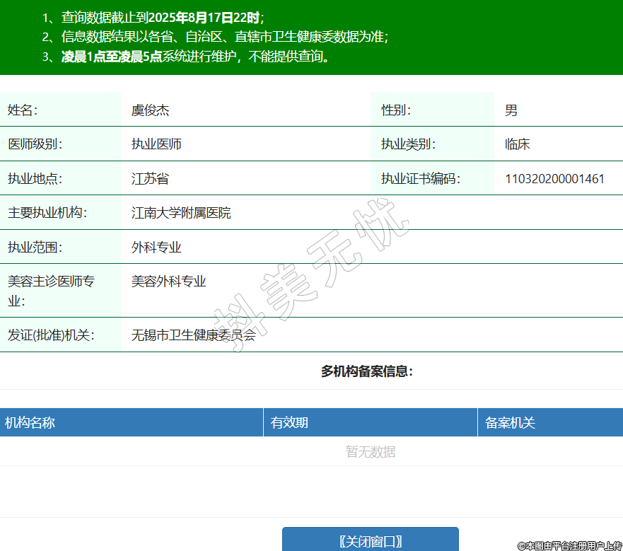 姓名:虞俊杰性別:男醫(yī)師級(jí)別:執(zhí)業(yè)醫(yī)師執(zhí)業(yè)類別:臨床執(zhí)業(yè)地點(diǎn):江蘇省執(zhí)業(yè)證書編碼:110320200001461主要執(zhí)業(yè)機(jī)構(gòu):江南大學(xué)附屬醫(yī)院執(zhí)業(yè)范圍:外科專業(yè)美容主診醫(yī)師專業(yè):美容外科專業(yè)發(fā)證(批準(zhǔn))機(jī)關(guān):無(wú)錫市衛(wèi)生健康委員會(huì) -