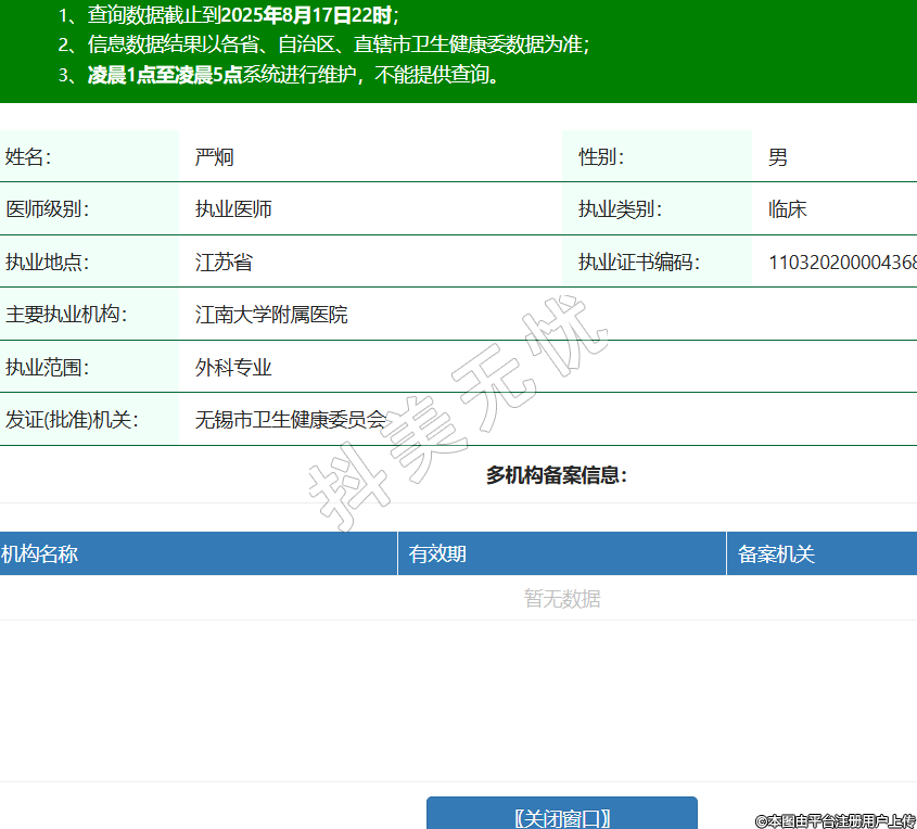 姓名:嚴炯性別:男醫(yī)師級別:執(zhí)業(yè)醫(yī)師執(zhí)業(yè)類別:臨床執(zhí)業(yè)地點:江蘇省執(zhí)業(yè)證書編碼:110320200004368主要執(zhí)業(yè)機構:江南大學附屬醫(yī)院執(zhí)業(yè)范圍:外科專業(yè)發(fā)證(批準)機關:無錫市衛(wèi)生健康委員會 -