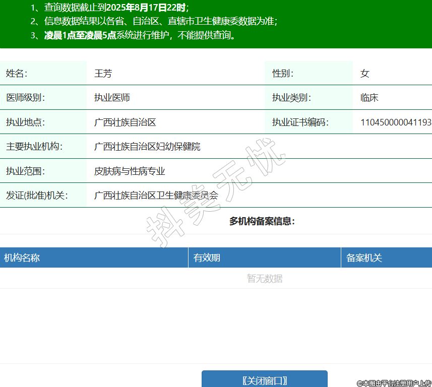 姓名:王芳性別:女醫(yī)師級(jí)別:執(zhí)業(yè)醫(yī)師執(zhí)業(yè)類別:臨床執(zhí)業(yè)地點(diǎn):廣西壯族自治區(qū)執(zhí)業(yè)證書編碼:110450000041193主要執(zhí)業(yè)機(jī)構(gòu):廣西壯族自治區(qū)婦幼保健院執(zhí)業(yè)范圍:皮膚病與性病專業(yè)發(fā)證(批準(zhǔn))機(jī)關(guān):廣西壯族自治區(qū)衛(wèi)生健康委員會(huì) -