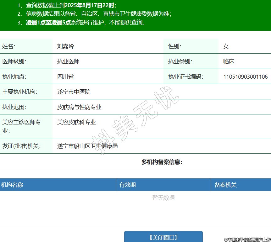 姓名:劉嘉玲性別:女醫(yī)師級(jí)別:執(zhí)業(yè)醫(yī)師執(zhí)業(yè)類別:臨床執(zhí)業(yè)地點(diǎn):四川省執(zhí)業(yè)證書編碼:110510903001106主要執(zhí)業(yè)機(jī)構(gòu):遂寧市中醫(yī)院執(zhí)業(yè)范圍:皮膚病與性病專業(yè)美容主診醫(yī)師專業(yè):美容皮膚科專業(yè)發(fā)證(批準(zhǔn))機(jī)關(guān):遂寧市船山區(qū)衛(wèi)生健康局 -