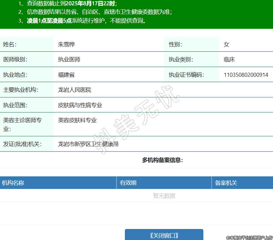姓名:朱雪樺性別:女醫(yī)師級別:執(zhí)業(yè)醫(yī)師執(zhí)業(yè)類別:臨床執(zhí)業(yè)地點(diǎn):福建省執(zhí)業(yè)證書編碼:110350802000914主要執(zhí)業(yè)機(jī)構(gòu):龍巖人民醫(yī)院執(zhí)業(yè)范圍:皮膚病與性病專業(yè)美容主診醫(yī)師專業(yè):美容皮膚科專業(yè)發(fā)證(批準(zhǔn))機(jī)關(guān):龍巖市新羅區(qū)衛(wèi)生健康局 -