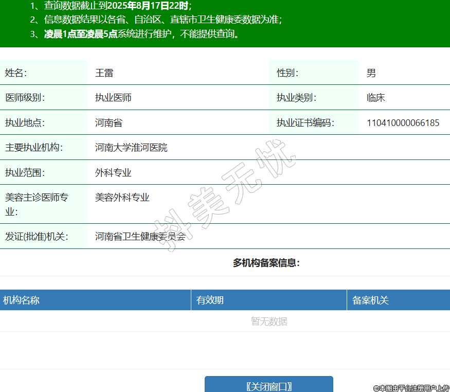 姓名:王雷性別:男醫(yī)師級(jí)別:執(zhí)業(yè)醫(yī)師執(zhí)業(yè)類別:臨床執(zhí)業(yè)地點(diǎn):河南省執(zhí)業(yè)證書編碼:110410000066185主要執(zhí)業(yè)機(jī)構(gòu):河南大學(xué)淮河醫(yī)院執(zhí)業(yè)范圍:外科專業(yè)美容主診醫(yī)師專業(yè):美容外科專業(yè)發(fā)證(批準(zhǔn))機(jī)關(guān):河南省衛(wèi)生健康委員會(huì) -