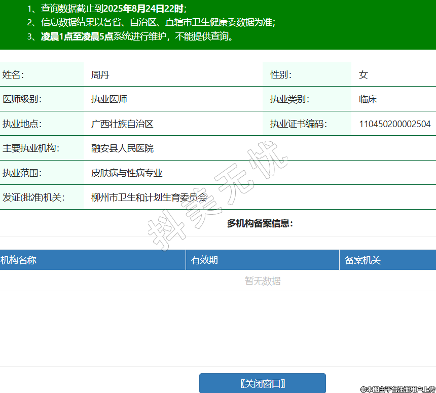 姓名:周丹性別:女醫(yī)師級(jí)別:執(zhí)業(yè)醫(yī)師執(zhí)業(yè)類別:臨床執(zhí)業(yè)地點(diǎn):廣西壯族自治區(qū)執(zhí)業(yè)證書編碼:110450200002504主要執(zhí)業(yè)機(jī)構(gòu):融安縣人民醫(yī)院執(zhí)業(yè)范圍:皮膚病與性病專業(yè)發(fā)證(批準(zhǔn))機(jī)關(guān):柳州市衛(wèi)生和計(jì)劃生育委員會(huì) -