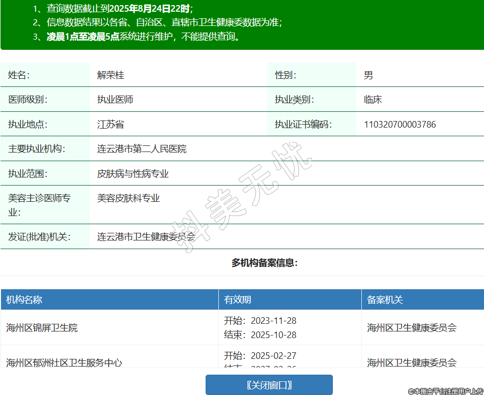 姓名:解榮桂性別:男醫(yī)師級(jí)別:執(zhí)業(yè)醫(yī)師執(zhí)業(yè)類別:臨床執(zhí)業(yè)地點(diǎn):江蘇省執(zhí)業(yè)證書編碼:110320700003786主要執(zhí)業(yè)機(jī)構(gòu):連云港市第二人民醫(yī)院執(zhí)業(yè)范圍:皮膚病與性病專業(yè)美容主診醫(yī)師專業(yè):美容皮膚科專業(yè)發(fā)證(批準(zhǔn))機(jī)關(guān):連云港市衛(wèi)生健康委員會(huì)多機(jī)構(gòu)備案信息:機(jī)構(gòu)名稱 有效期 備案機(jī)關(guān) 海州區(qū)錦屏衛(wèi)生院 開始:2023-11-28結(jié)束:2025-10-28海州區(qū)衛(wèi)生健康委員會(huì) 海州區(qū)郁洲社區(qū)衛(wèi)生服務(wù)中心 開始:2025-02-27結(jié)束:2027-02-26海州區(qū)衛(wèi)生健康委員會(huì) -