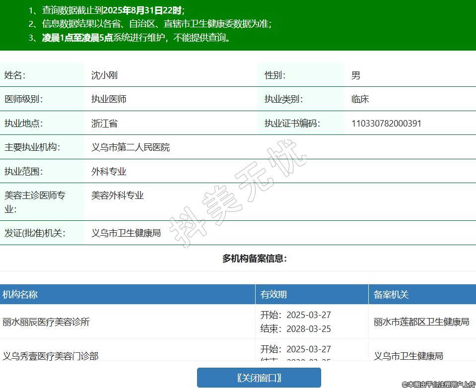 姓名:沈小剛性別:男醫(yī)師級別:執(zhí)業(yè)醫(yī)師執(zhí)業(yè)類別:臨床執(zhí)業(yè)地點(diǎn):浙江省執(zhí)業(yè)證書編碼:110330782000391主要執(zhí)業(yè)機(jī)構(gòu):義烏市第二人民醫(yī)院執(zhí)業(yè)范圍:外科專業(yè)美容主診醫(yī)師專業(yè):美容外科專業(yè)發(fā)證(批準(zhǔn))機(jī)關(guān):義烏市衛(wèi)生健康局多機(jī)構(gòu)備案信息:機(jī)構(gòu)名稱 有效期 備案機(jī)關(guān) 麗水麗辰醫(yī)療美容診所 開始:2025-03-27結(jié)束:2028-03-25麗水市蓮都區(qū)衛(wèi)生健康局 義烏秀壹醫(yī)療美容門診部 開始:2025-03-27結(jié)束:2030-03-25義烏市衛(wèi)生健康局 義烏百姿醫(yī)療美容門診部 開始:2025-06-11結(jié)束:2028-06-09義烏市衛(wèi)生健康局 義烏媞雅醫(yī)療美容有限公司稠城診所 開始:2025-06-26結(jié)束:2026-06-25義烏市衛(wèi)生健康局 義烏和煦醫(yī)療管理有限公司稠城醫(yī)療美容診所 開始:2025-08-04結(jié)束:2026-08-03義烏市衛(wèi)生健康局 -