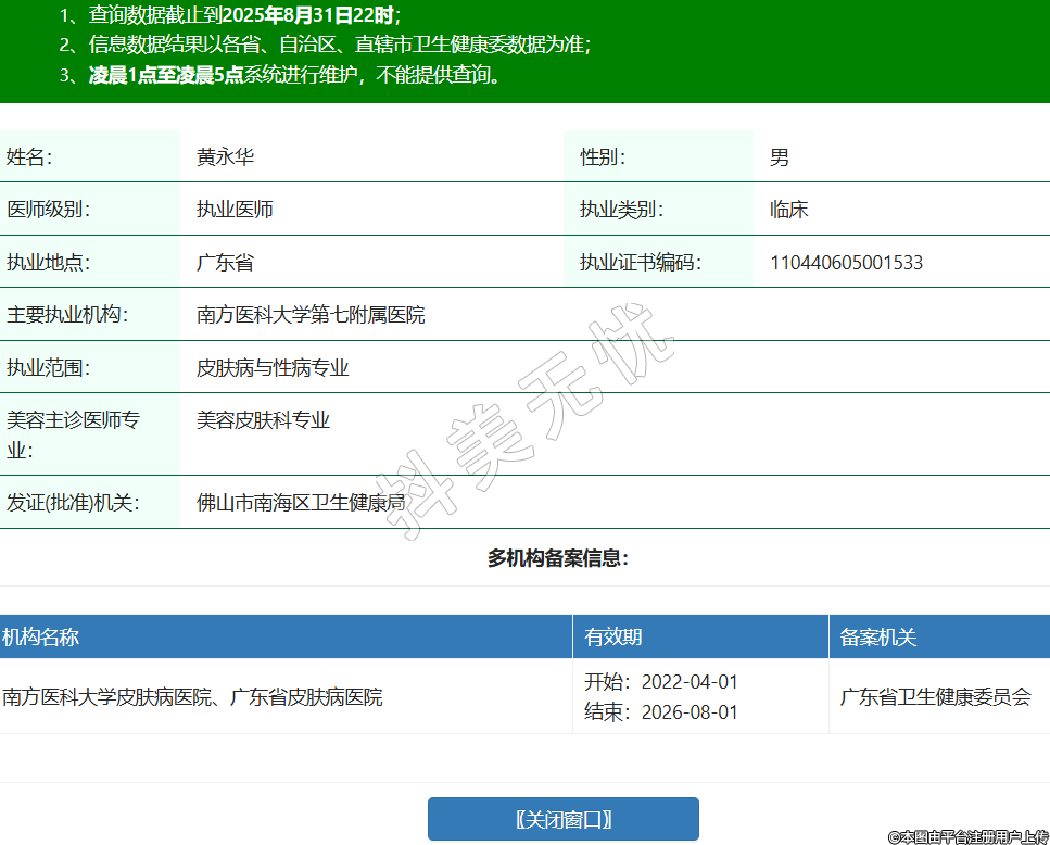姓名:黃永華性別:男醫(yī)師級別:執(zhí)業(yè)醫(yī)師執(zhí)業(yè)類別:臨床執(zhí)業(yè)地點:廣東省執(zhí)業(yè)證書編碼:110440605001533主要執(zhí)業(yè)機構:南方醫(yī)科大學第七附屬醫(yī)院執(zhí)業(yè)范圍:皮膚病與性病專業(yè)美容主診醫(yī)師專業(yè):美容皮膚科專業(yè)發(fā)證(批準)機關:佛山市南海區(qū)衛(wèi)生健康局多機構備案信息:機構名稱 有效期 備案機關 南方醫(yī)科大學皮膚病醫(yī)院、廣東省皮膚病醫(yī)院 開始:2022-04-01結束:2026-08-01廣東省衛(wèi)生健康委員會 -