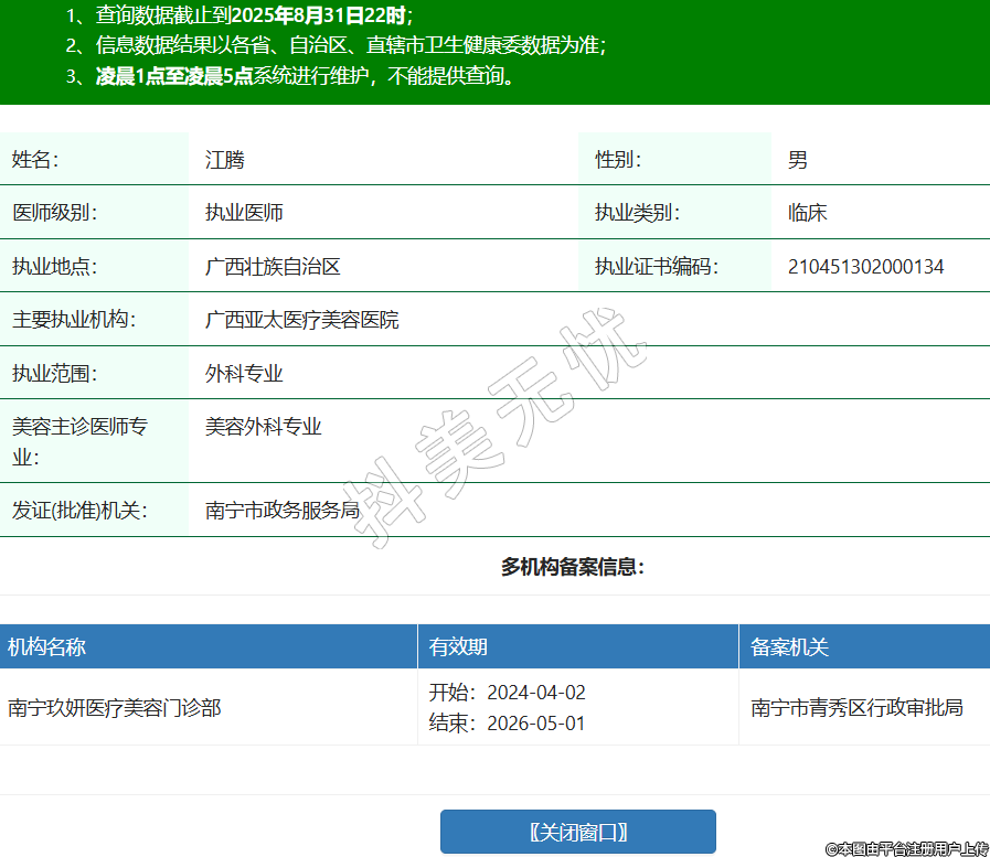 姓名:江騰性別:男醫(yī)師級別:執(zhí)業(yè)醫(yī)師執(zhí)業(yè)類別:臨床執(zhí)業(yè)地點:廣西壯族自治區(qū)執(zhí)業(yè)證書編碼:210451302000134主要執(zhí)業(yè)機構(gòu):廣西亞太醫(yī)療美容醫(yī)院執(zhí)業(yè)范圍:外科專業(yè)美容主診醫(yī)師專業(yè):美容外科專業(yè)發(fā)證(批準(zhǔn))機關(guān):南寧市政務(wù)服務(wù)局多機構(gòu)備案信息:機構(gòu)名稱 有效期 備案機關(guān) 南寧玖妍醫(yī)療美容門診部 開始:2024-04-02結(jié)束:2026-05-01南寧市青秀區(qū)行政審批局 -