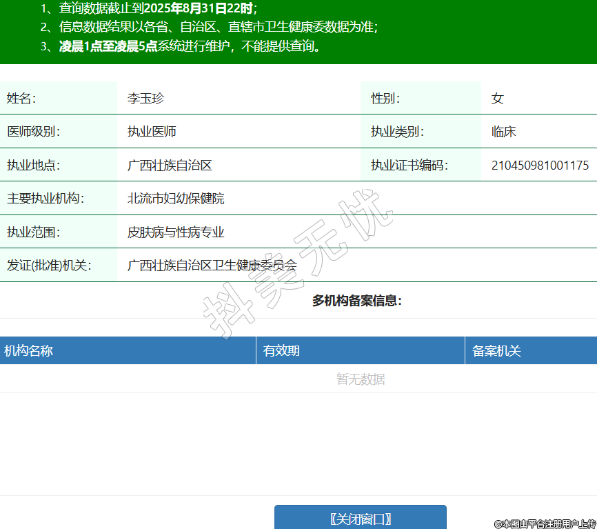 姓名:李玉珍性別:女醫(yī)師級(jí)別:執(zhí)業(yè)醫(yī)師執(zhí)業(yè)類別:臨床執(zhí)業(yè)地點(diǎn):廣西壯族自治區(qū)執(zhí)業(yè)證書編碼:210450981001175主要執(zhí)業(yè)機(jī)構(gòu):北流市婦幼保健院執(zhí)業(yè)范圍:皮膚病與性病專業(yè)發(fā)證(批準(zhǔn))機(jī)關(guān):廣西壯族自治區(qū)衛(wèi)生健康委員會(huì) -