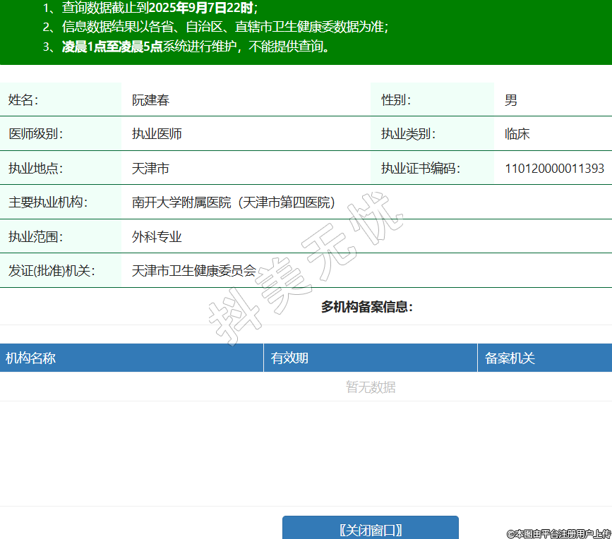 姓名:阮建春性別:男醫(yī)師級別:執(zhí)業(yè)醫(yī)師執(zhí)業(yè)類別:臨床執(zhí)業(yè)地點(diǎn):天津市執(zhí)業(yè)證書編碼:110120000011393主要執(zhí)業(yè)機(jī)構(gòu):南開大學(xué)附屬醫(yī)院(天津市第四醫(yī)院)執(zhí)業(yè)范圍:外科專業(yè)發(fā)證(批準(zhǔn))機(jī)關(guān):天津市衛(wèi)生健康委員會 -