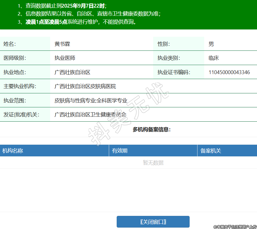 姓名:黃書霖性別:男醫(yī)師級別:執(zhí)業(yè)醫(yī)師執(zhí)業(yè)類別:臨床執(zhí)業(yè)地點:廣西壯族自治區(qū)執(zhí)業(yè)證書編碼:110450000043346主要執(zhí)業(yè)機構:廣西壯族自治區(qū)皮膚病醫(yī)院執(zhí)業(yè)范圍:皮膚病與性病專業(yè);全科醫(yī)學專業(yè)發(fā)證(批準)機關:廣西壯族自治區(qū)衛(wèi)生健康委員會 -