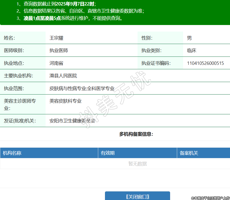 姓名:王宗耀性別:男醫(yī)師級別:執(zhí)業(yè)醫(yī)師執(zhí)業(yè)類別:臨床執(zhí)業(yè)地點:河南省執(zhí)業(yè)證書編碼:110410526000515主要執(zhí)業(yè)機構(gòu):滑縣人民醫(yī)院執(zhí)業(yè)范圍:皮膚病與性病專業(yè);全科醫(yī)學專業(yè)美容主診醫(yī)師專業(yè):美容皮膚科專業(yè)發(fā)證(批準)機關(guān):安陽市衛(wèi)生健康委員會 -
