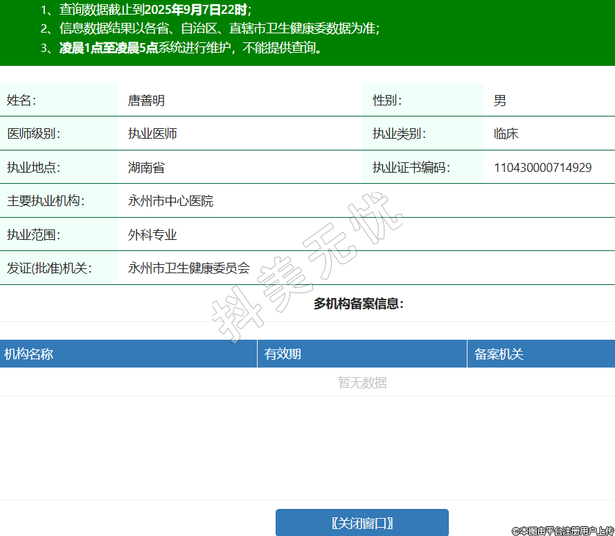 姓名:唐善明性別:男醫(yī)師級(jí)別:執(zhí)業(yè)醫(yī)師執(zhí)業(yè)類(lèi)別:臨床執(zhí)業(yè)地點(diǎn):湖南省執(zhí)業(yè)證書(shū)編碼:110430000714929主要執(zhí)業(yè)機(jī)構(gòu):永州市中心醫(yī)院執(zhí)業(yè)范圍:外科專(zhuān)業(yè)發(fā)證(批準(zhǔn))機(jī)關(guān):永州市衛(wèi)生健康委員會(huì) -