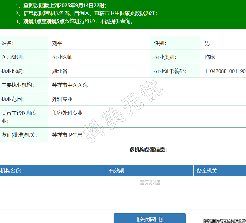 姓名:劉平性別:男醫(yī)師級別:執(zhí)業(yè)醫(yī)師執(zhí)業(yè)類別:臨床執(zhí)業(yè)地點(diǎn):湖北省執(zhí)業(yè)證書編碼:110420881001190主要執(zhí)業(yè)機(jī)構(gòu):鐘祥市中醫(yī)醫(yī)院執(zhí)業(yè)范圍:外科專業(yè)美容主診醫(yī)師專業(yè):美容外科專業(yè)發(fā)證(批準(zhǔn))機(jī)關(guān):鐘祥市衛(wèi)生局 -