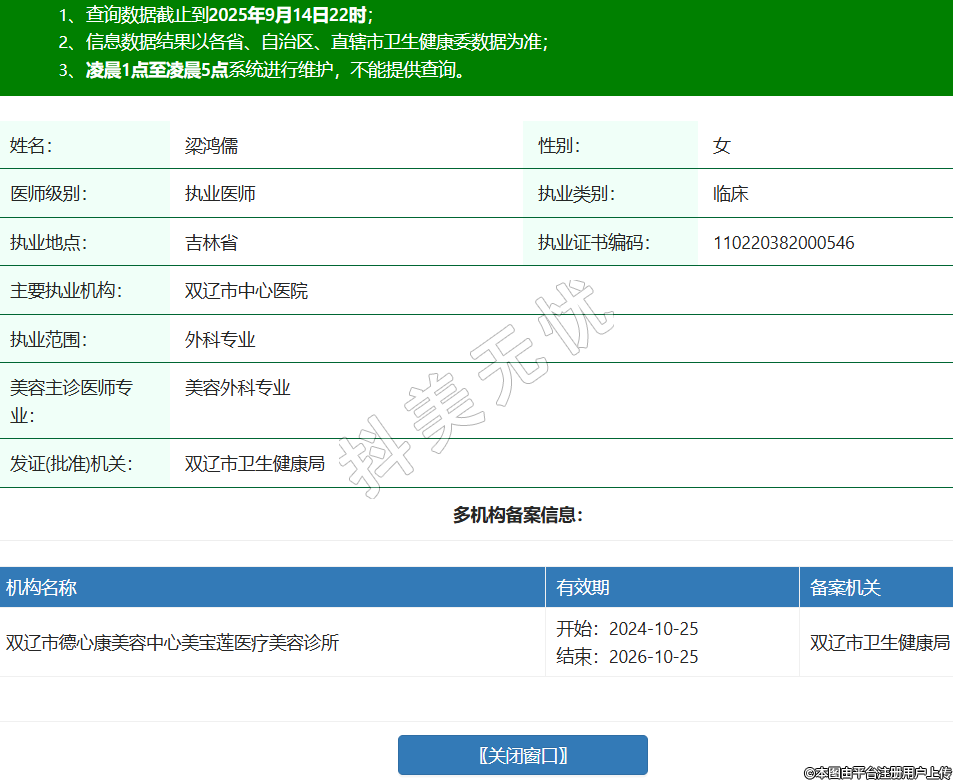 姓名:梁鴻儒性別:女醫(yī)師級(jí)別:執(zhí)業(yè)醫(yī)師執(zhí)業(yè)類別:臨床執(zhí)業(yè)地點(diǎn):吉林省執(zhí)業(yè)證書編碼:110220382000546主要執(zhí)業(yè)機(jī)構(gòu):雙遼市中心醫(yī)院執(zhí)業(yè)范圍:外科專業(yè)美容主診醫(yī)師專業(yè):美容外科專業(yè)發(fā)證(批準(zhǔn))機(jī)關(guān):雙遼市衛(wèi)生健康局多機(jī)構(gòu)備案信息:機(jī)構(gòu)名稱 有效期 備案機(jī)關(guān) 雙遼市德心康美容中心美寶蓮醫(yī)療美容診所 開始:2024-10-25結(jié)束:2026-10-25雙遼市衛(wèi)生健康局 -