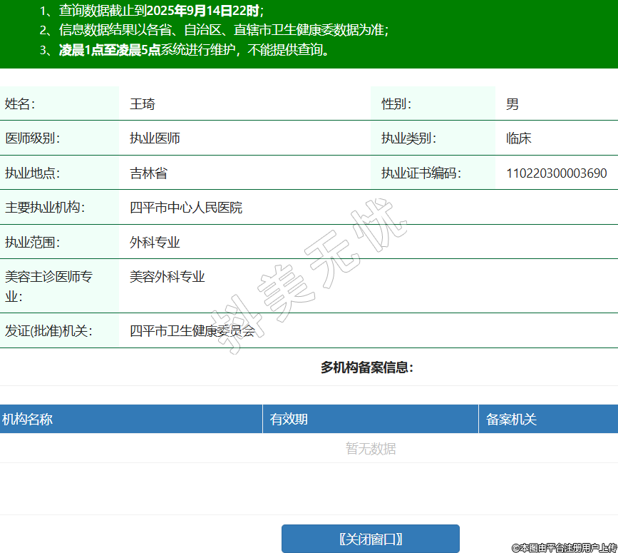 姓名:王琦性別:男醫(yī)師級別:執(zhí)業(yè)醫(yī)師執(zhí)業(yè)類別:臨床執(zhí)業(yè)地點:吉林省執(zhí)業(yè)證書編碼:110220300003690主要執(zhí)業(yè)機構(gòu):四平市中心人民醫(yī)院執(zhí)業(yè)范圍:外科專業(yè)美容主診醫(yī)師專業(yè):美容外科專業(yè)發(fā)證(批準)機關(guān):四平市衛(wèi)生健康委員會 -