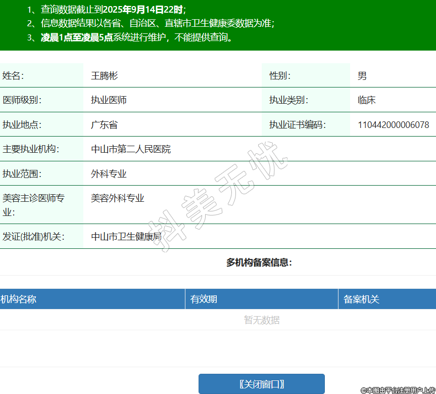 姓名:王騰彬性別:男醫(yī)師級(jí)別:執(zhí)業(yè)醫(yī)師執(zhí)業(yè)類(lèi)別:臨床執(zhí)業(yè)地點(diǎn):廣東省執(zhí)業(yè)證書(shū)編碼:110442000006078主要執(zhí)業(yè)機(jī)構(gòu):中山市第二人民醫(yī)院執(zhí)業(yè)范圍:外科專業(yè)美容主診醫(yī)師專業(yè):美容外科專業(yè)發(fā)證(批準(zhǔn))機(jī)關(guān):中山市衛(wèi)生健康局 -
