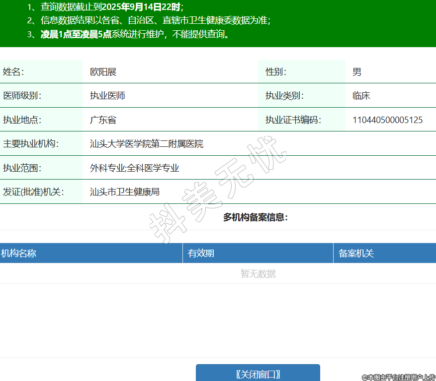 姓名:歐陽展性別:男醫(yī)師級別:執(zhí)業(yè)醫(yī)師執(zhí)業(yè)類別:臨床執(zhí)業(yè)地點:廣東省執(zhí)業(yè)證書編碼:110440500005125主要執(zhí)業(yè)機構(gòu):汕頭大學(xué)醫(yī)學(xué)院第二附屬醫(yī)院執(zhí)業(yè)范圍:外科專業(yè);全科醫(yī)學(xué)專業(yè)發(fā)證(批準(zhǔn))機關(guān):汕頭市衛(wèi)生健康局 -