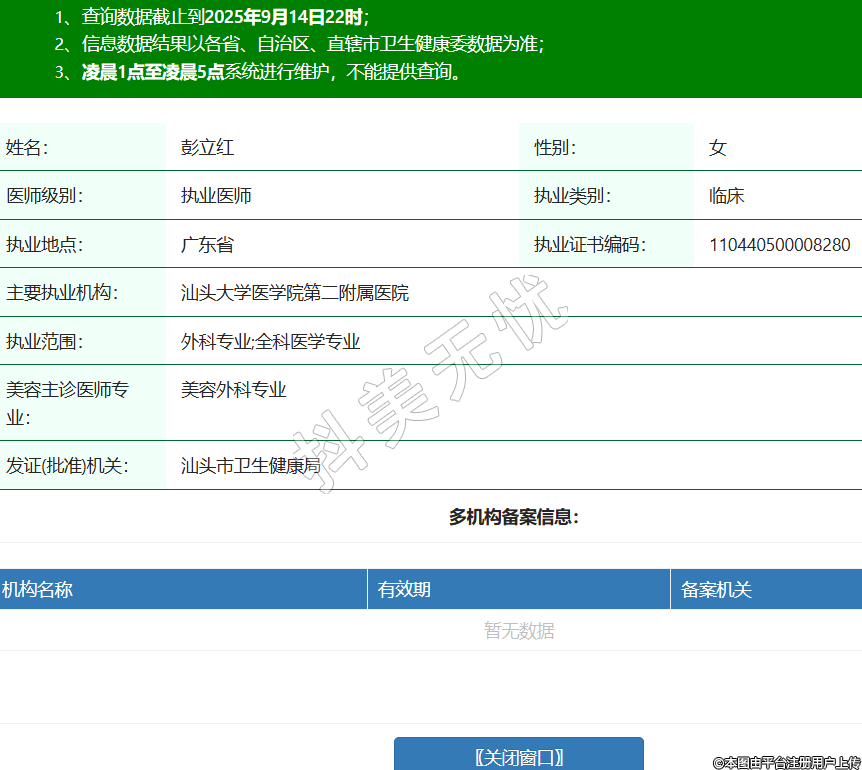 姓名:彭立紅性別:女醫(yī)師級別:執(zhí)業(yè)醫(yī)師執(zhí)業(yè)類別:臨床執(zhí)業(yè)地點:廣東省執(zhí)業(yè)證書編碼:110440500008280主要執(zhí)業(yè)機構(gòu):汕頭大學醫(yī)學院第二附屬醫(yī)院執(zhí)業(yè)范圍:外科專業(yè);全科醫(yī)學專業(yè)美容主診醫(yī)師專業(yè):美容外科專業(yè)發(fā)證(批準)機關(guān):汕頭市衛(wèi)生健康局 -