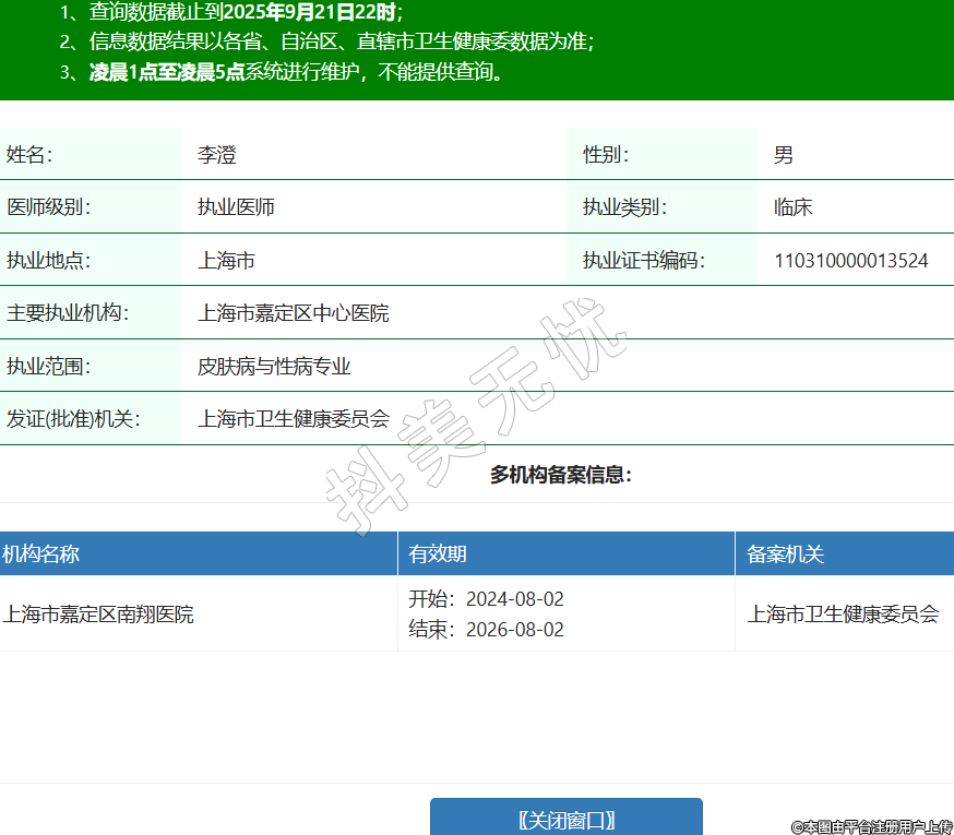 姓名:李澄性別:男醫(yī)師級(jí)別:執(zhí)業(yè)醫(yī)師執(zhí)業(yè)類別:臨床執(zhí)業(yè)地點(diǎn):上海市執(zhí)業(yè)證書編碼:110310000013524主要執(zhí)業(yè)機(jī)構(gòu):上海市嘉定區(qū)中心醫(yī)院執(zhí)業(yè)范圍:皮膚病與性病專業(yè)發(fā)證(批準(zhǔn))機(jī)關(guān):上海市衛(wèi)生健康委員會(huì)多機(jī)構(gòu)備案信息:機(jī)構(gòu)名稱 有效期 備案機(jī)關(guān) 上海市嘉定區(qū)南翔醫(yī)院 開始:2024-08-02結(jié)束:2026-08-02上海市衛(wèi)生健康委員會(huì) -
